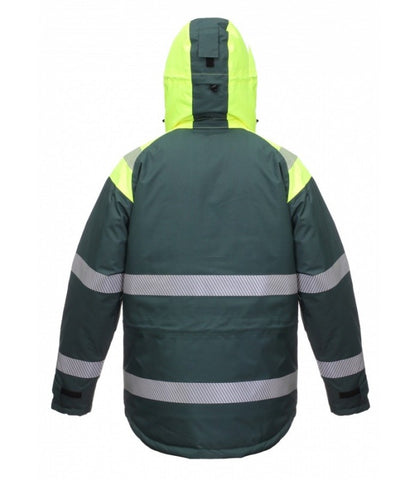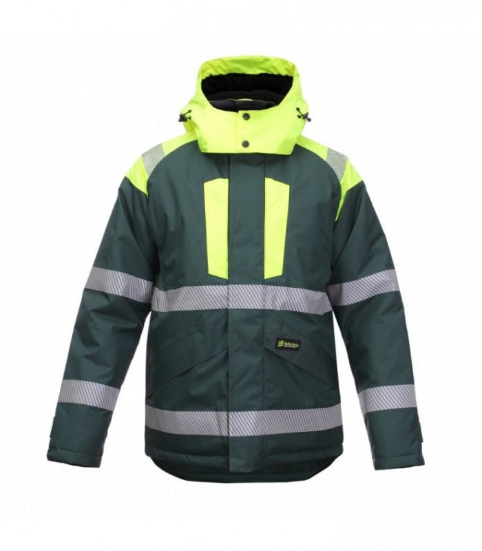 Silta un ūdensizturīga CANVAS jaka ar 5 cm atstarojošām segmentālām svītrām. Šī jaka ir vēja un ūdensnecaurlaidīga, pateicoties tās membrānas audumam. Jaka ir izgatavota no Oxford 300 auduma. Pateicoties īpaši biezajam 205g/m² sinteponiskajam materiālam, 100% poliestera audumam un siltumu noturošām aprocēm, tas īpaši sasilda skarbos laikapstākļos. Jakas kapuce ir noņemama un regulējama. Raglana piedurknes neierobežo kustības. Jaka aizverama ar rāvējslēdzēju priekšpusē un vēja necaurlaidīgu lenti. Šai darba jakai ir atstarojošas segmentālas svītras, kas atrodas: uz pleciem un krūtīm un gurnu zonā. Elastīgās aproces nodrošina kustību brīvību. Jūsu ērtībām jakai ir trīs ietilpīgas kabatas priekšpusē un krūšu zonā, kas aiztaisāmas ar rāvējslēdzēju. Siltinājums nav izņemams. Papildus: jakas iekšpusē ir rāvējslēdzējs apakšā, kas ļauj izšūt sev vēlamo logo tikai uz auduma augšējās kārtas.