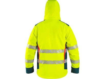 Augstas redzamības ūdensizturīga un vēja necaurlaidīga jaka ar noņemamu kapuci. Flīsa apkakle, padušu ventilācija, piedurknes ar regulējamu aproci, iekšējās aproces, pārklāts rāvējslēdzējs un spiedpogu aizdare, krūšu un sānu kabatas ar rāvējslēdzējiem, noņemams ID kartes turētājs labajā krūšu kabatā, segmentētas atstarojošas lentes, kontrastējošas HV sarkanas un petrolejas krāsas aksesuāri, iekšējās krūšu kabatas, aizdare apakšā, TPU membrāna, ūdensizturīgs materiāls līdz 8000 mm, izņemot vīles, elpojamība 5000 g/m2/24h.