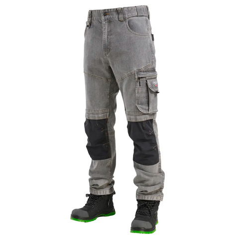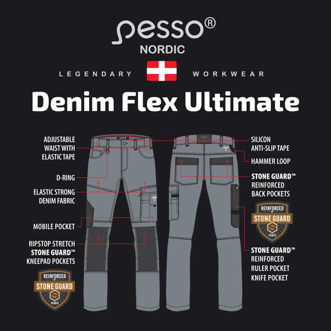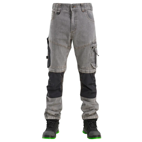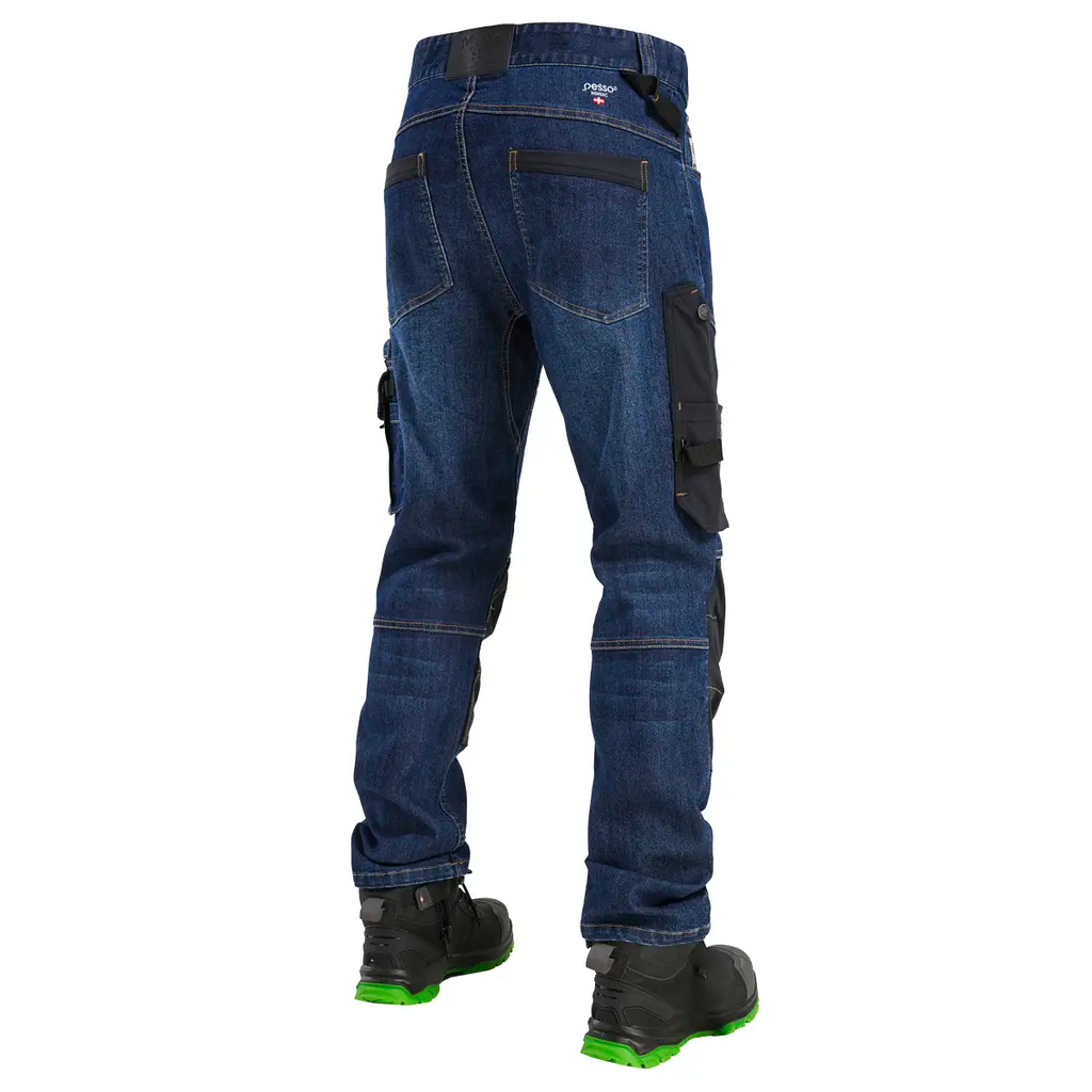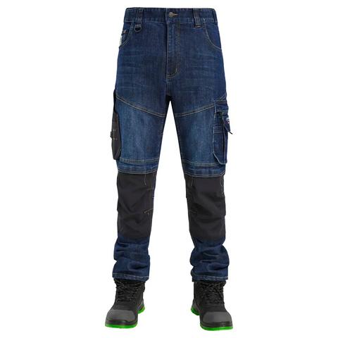 Elastīgs poli-kokvilnas/elastāna džinsa audums – nodrošina kustību brīvību un komfortu visas darba dienas garumā.